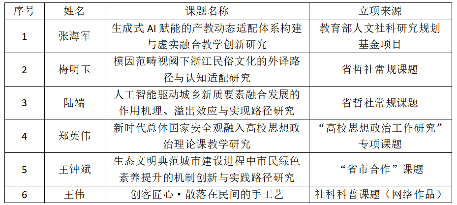 近日,教育部社会科学司和浙江省哲学社会科学规划办公布2025-2026年度多项立项名单,我校6项课题获批立项,覆盖常规课题、思政专项课题、省市合作课题、社科科普课题等多个类别,立项数量实现历史性突破。